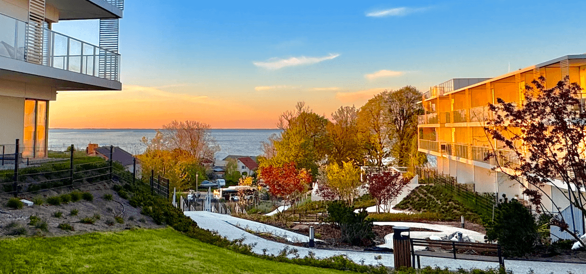 Lokalizacja inwestycji w Mechelinkach na niewielkim wzniesieniu, zaledwie 180 m od linii brzegowej Bałtyku, zapewnia doskonały widok na morze prawie z każdego tarasu. Bryły budynków wkomponowane w otaczającą przyrodę.