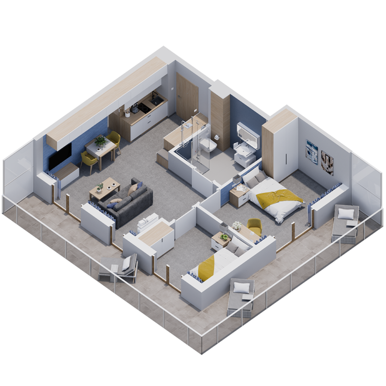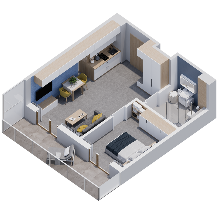 Ein elegantes Apartment mit einem separaten Schlafzimmer, gibt Ihnen den Komfort der Privatsphäre und ermöglicht es Ihnen, Ihren Arbeitsbereich, ein Schaufenster für Ihre Lieblings-Hobby zu organisieren, und bietet mehr Stauraum.